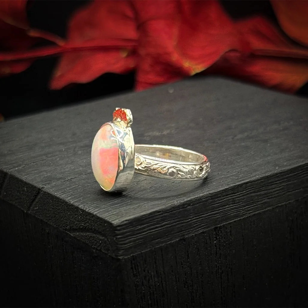 Set in 100% sterling silver, the ring showcases a beautifully engraved floral band that adds a delicate elegance to the design. George's signature 18-karat gold blossom accents further enhance the ring's uniqueness, offering a luxurious touch without overpowering the natural beauty of the opal. The balance of color, texture, and detail makes this piece an unforgettable addition to any jewelry collection.
