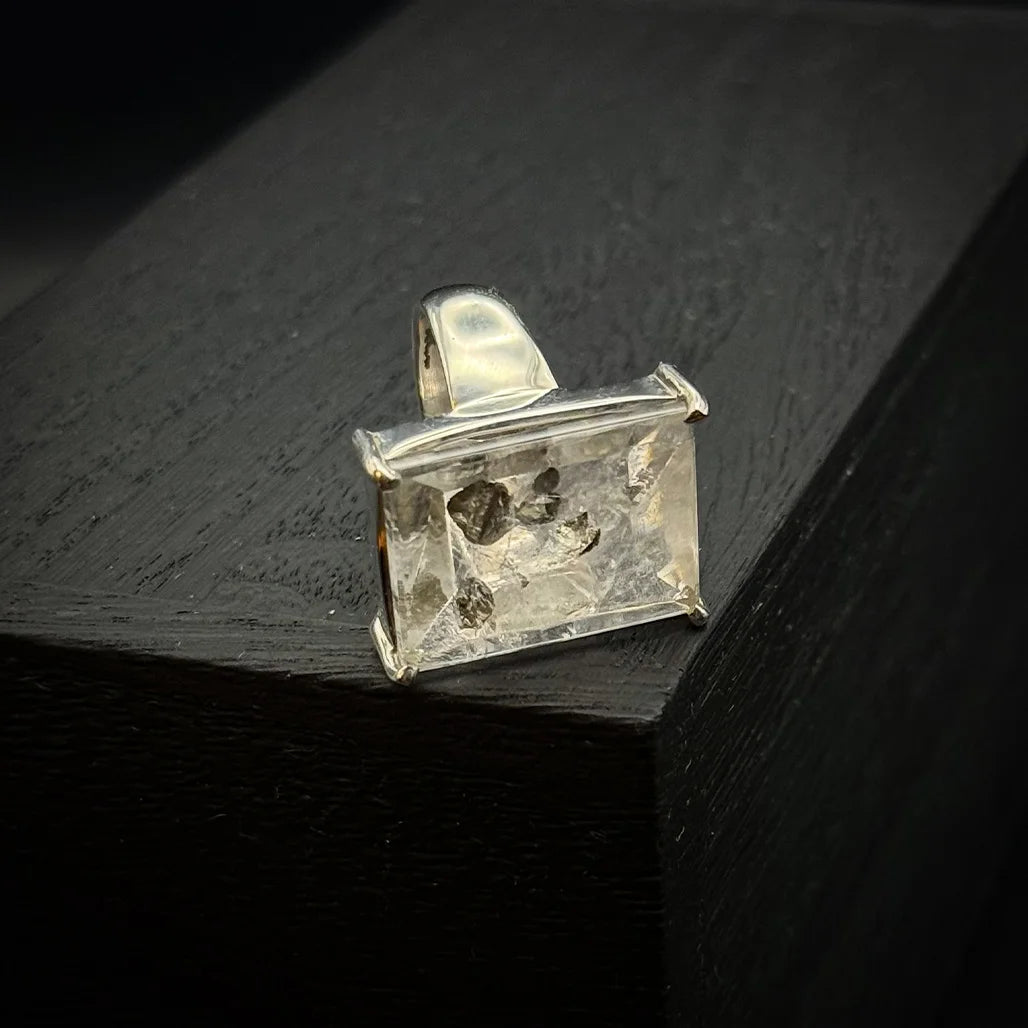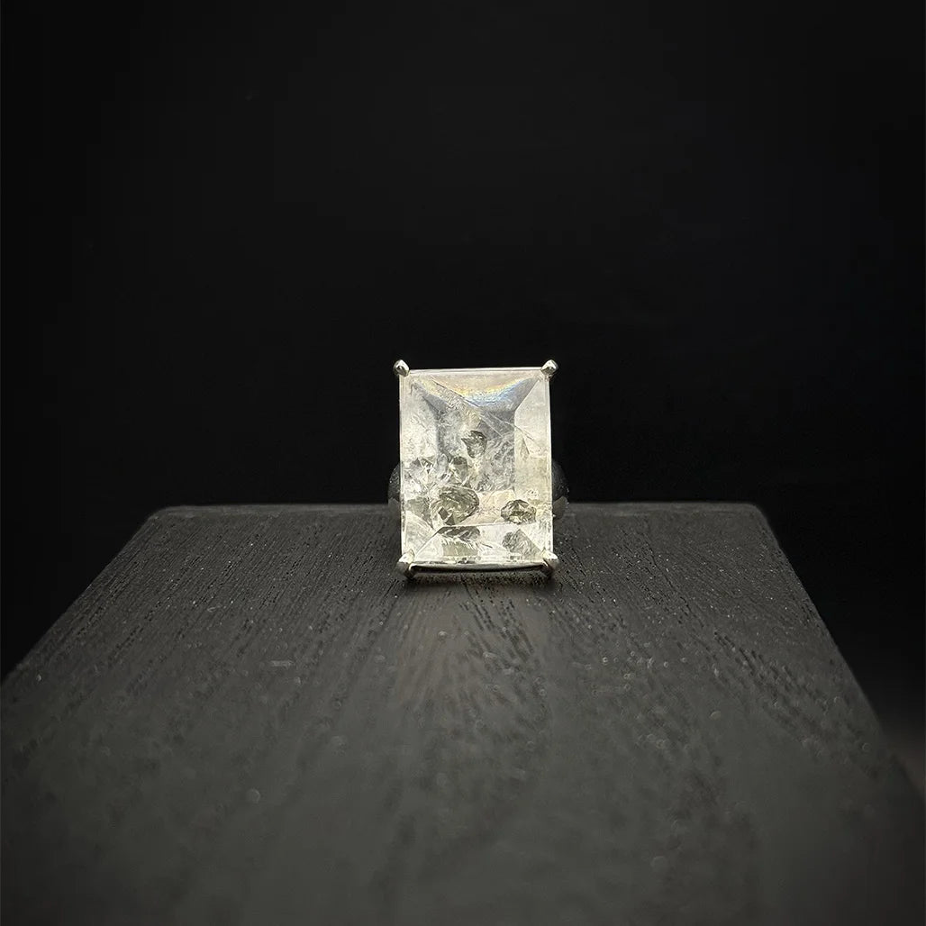 This Inclusion Quartz Ring is a sophisticated piece, set in a sterling silver prong setting that beautifully highlights the elegance of the stone. The stone itself features a striking square cut, adding to its refined and timeless appeal. The crystal-clear quartz showcases natural fractures within, which create stunning rainbows when light shines through—each reflection adding to its allure.