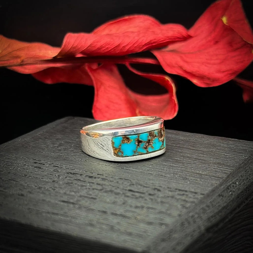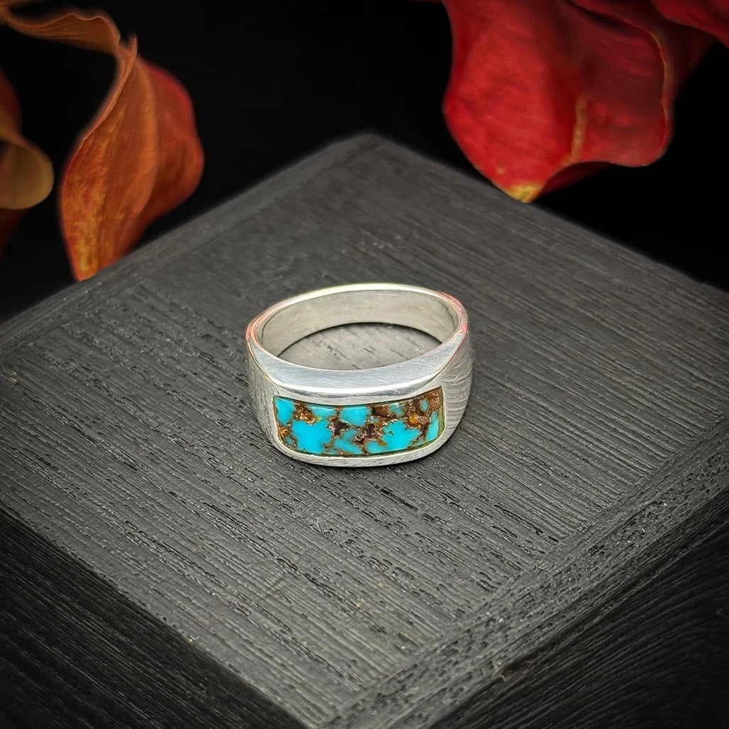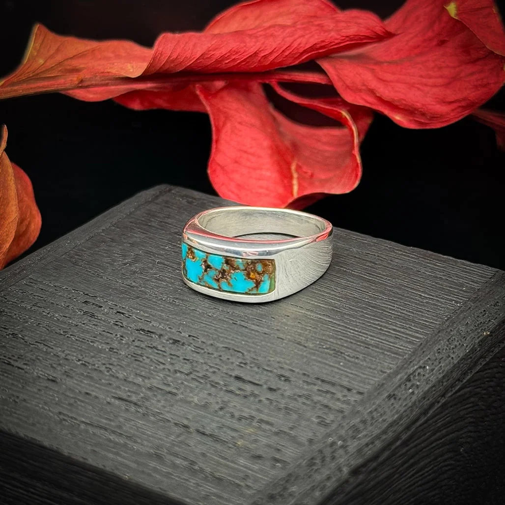 At the heart of this ring is a breathtaking piece of Kingman Turquoise, renowned for its vivid blue hues. The vibrant turquoise is further enhanced by a rich chocolate-brown matrix, creating a striking contrast that makes the stone truly stand out.