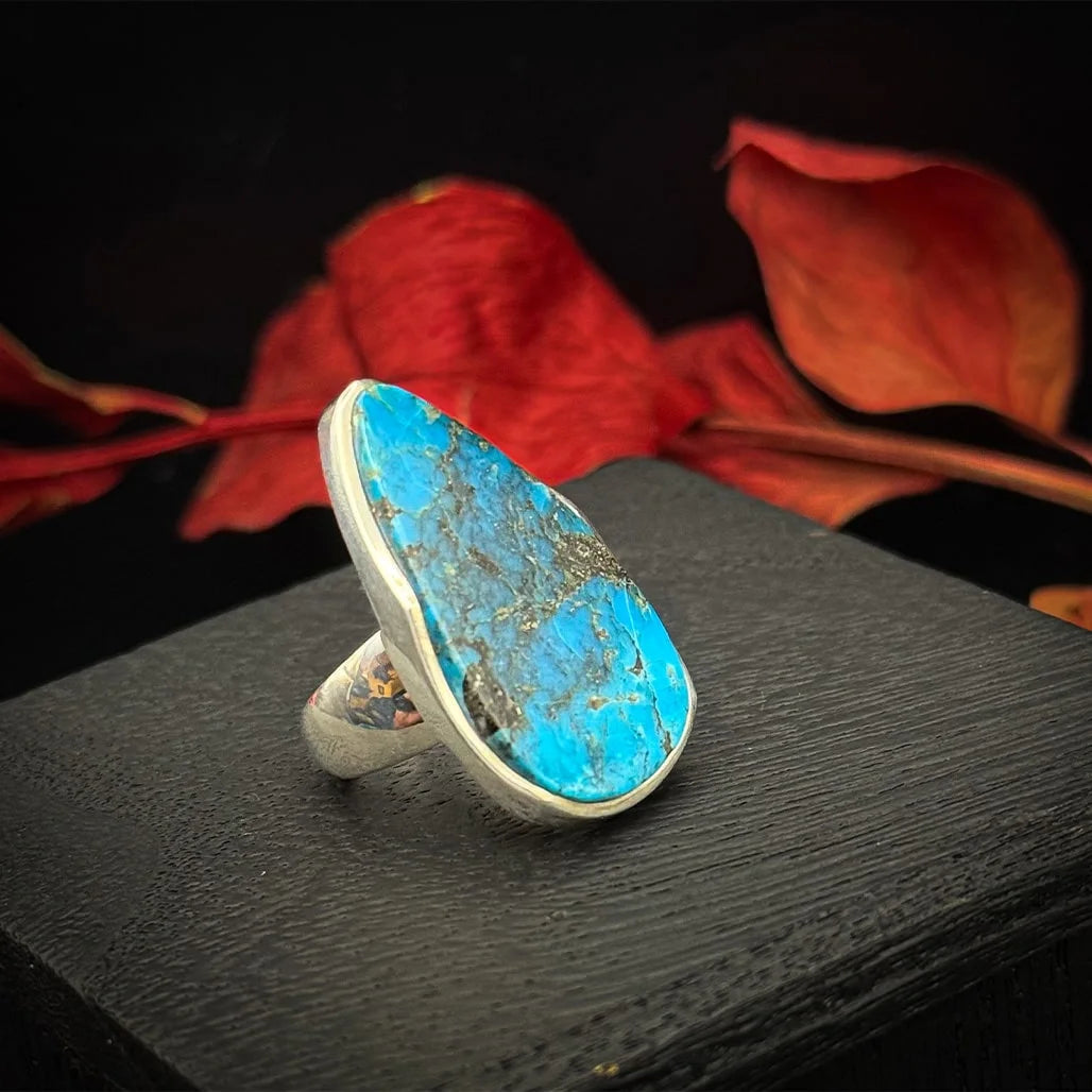 This striking Kingman Turquoise ring is a true statement piece, featuring bold and vibrant blue hues that Kingman is renowned for. George skillfully cut this stone into an abstract oval shape, thoughtfully highlighting its natural inclusions and unique character. The deep black matrix contrasts beautifully against the bright blue, creating a bold and eye-catching design.
