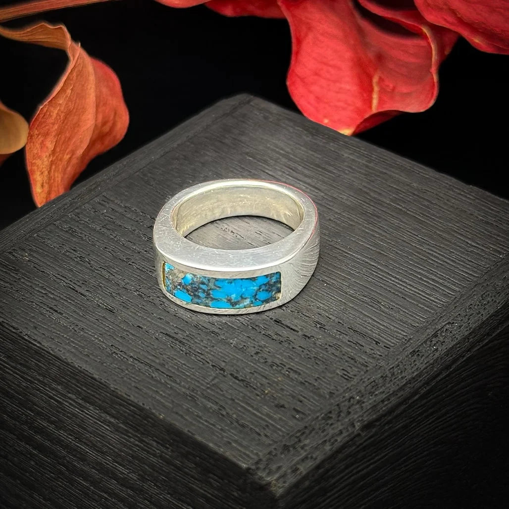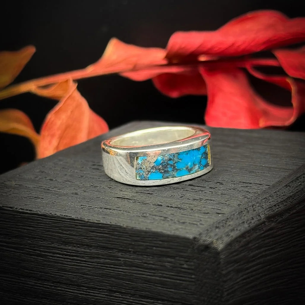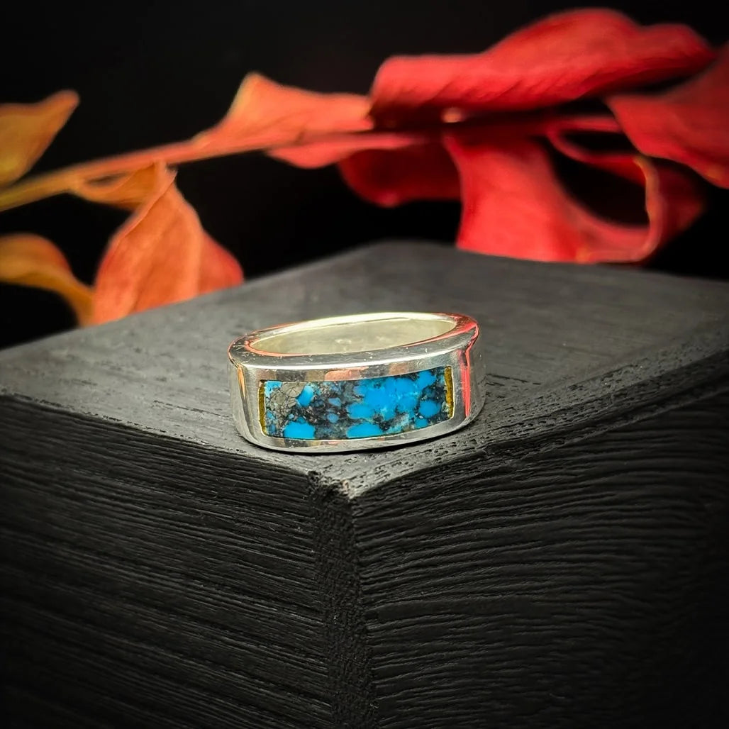 This stunning Kingman Turquoise with Pyrite ring is an eye-catching masterpiece, with its bold, vibrant blue hue that demands attention. The contrasting deep black matrix perfectly sets off the bright turquoise, and the sparkling flecks of Pyrite add an extra layer of flair and shine. Handcrafted by George, this ring is part of a special collection designed for both strength and style, with a sturdy, bold structure that gives it a substantial weight. Though it’s considered a gents' ring, it’s a versatile piece that can be enjoyed by anyone who appreciates its striking design.