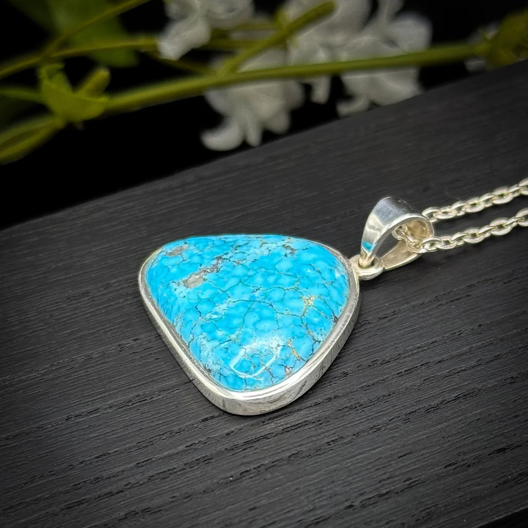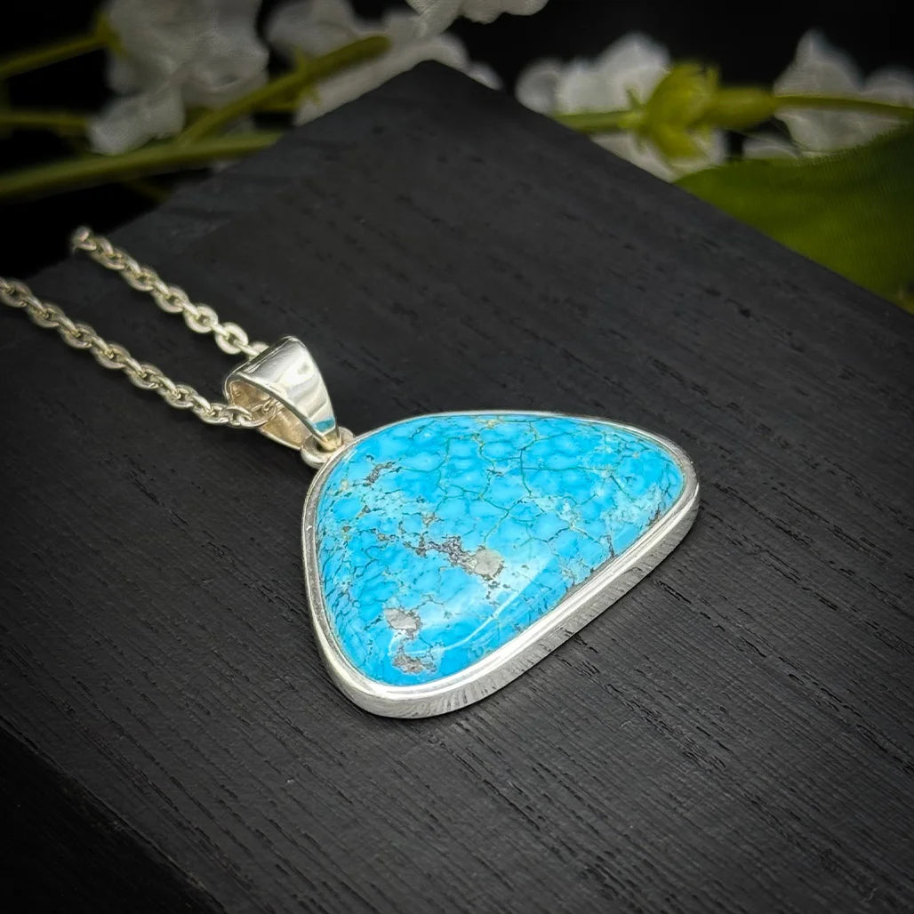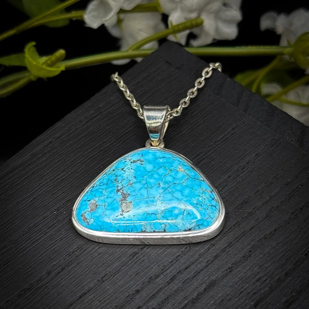 The sterling silver setting is simple yet elegant, allowing the turquoise to shine, and the moveable bail ensures this piece sits just right. It is certainly a one-of-a-kind pendant with timeless beauty and incredible presence. Chain not included.
