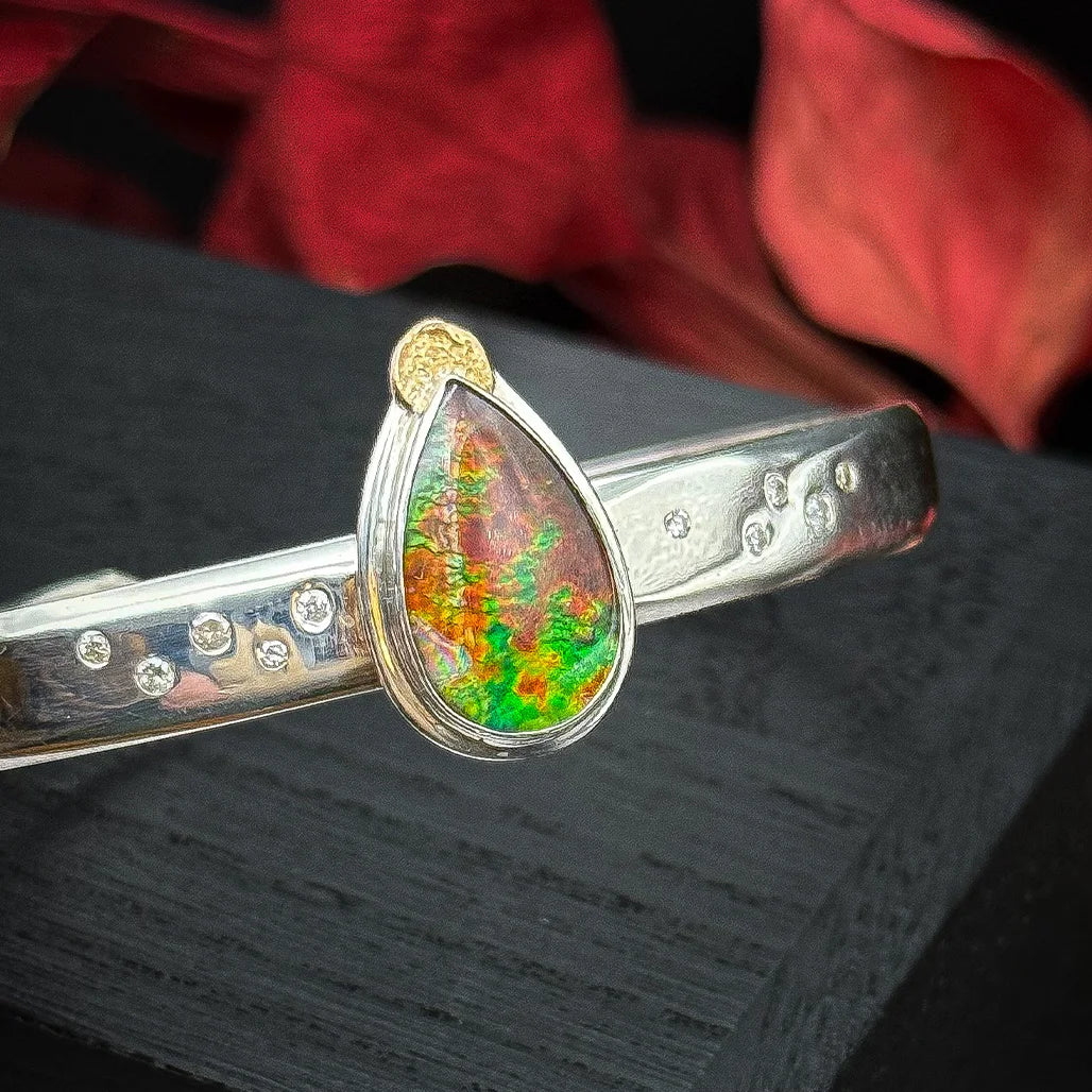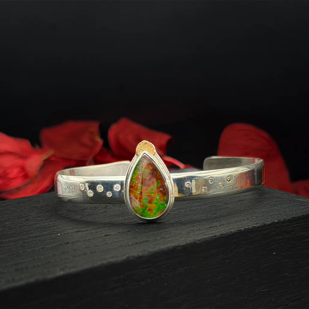 The sterling silver cuff features 10 sparkling natural diamonds, set meticulously to complement the vibrancy of the Ammolite. The silver’s polished finish contrasts beautifully with the organic patterns of the stone, creating a harmonious balance between sleek elegance and natural wonder.