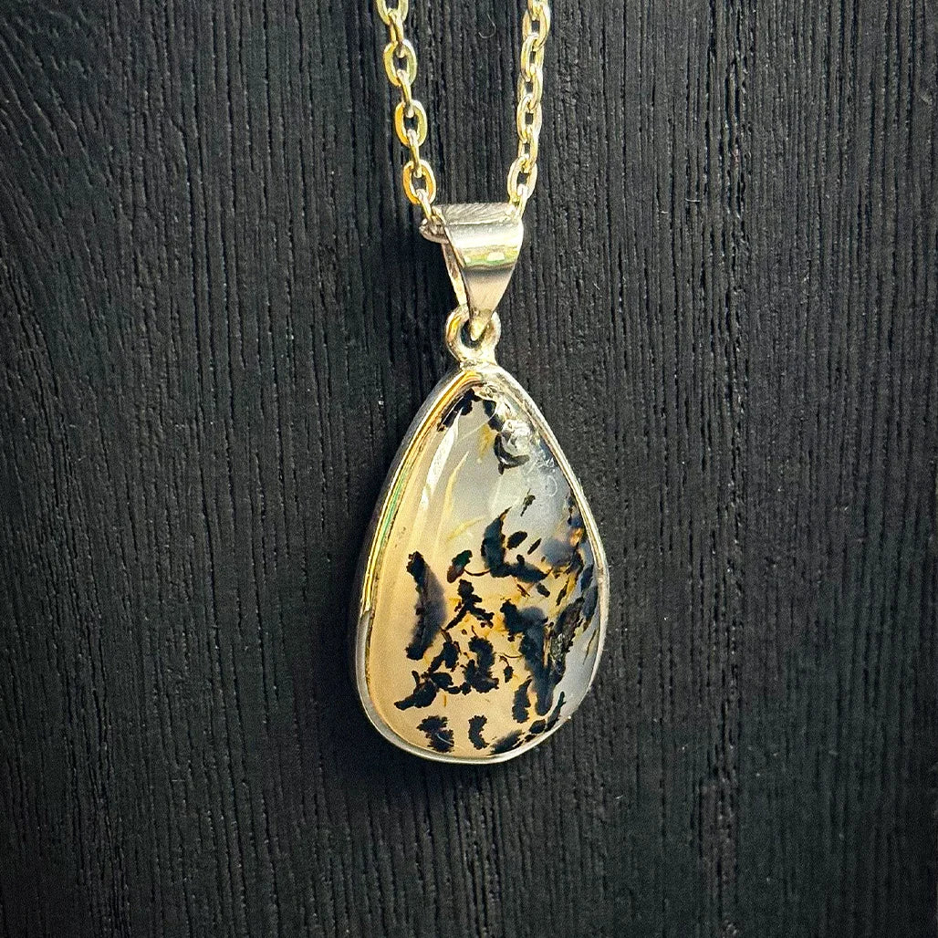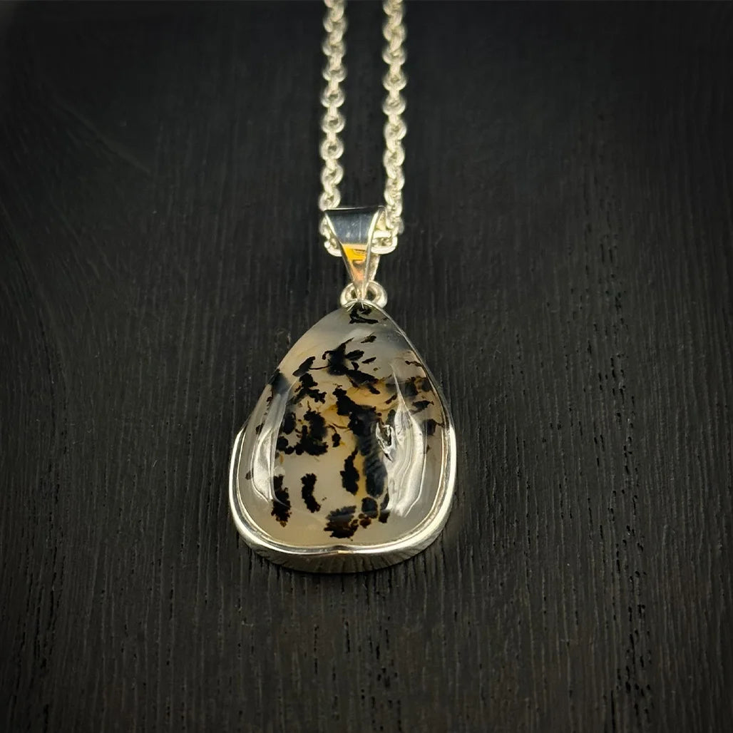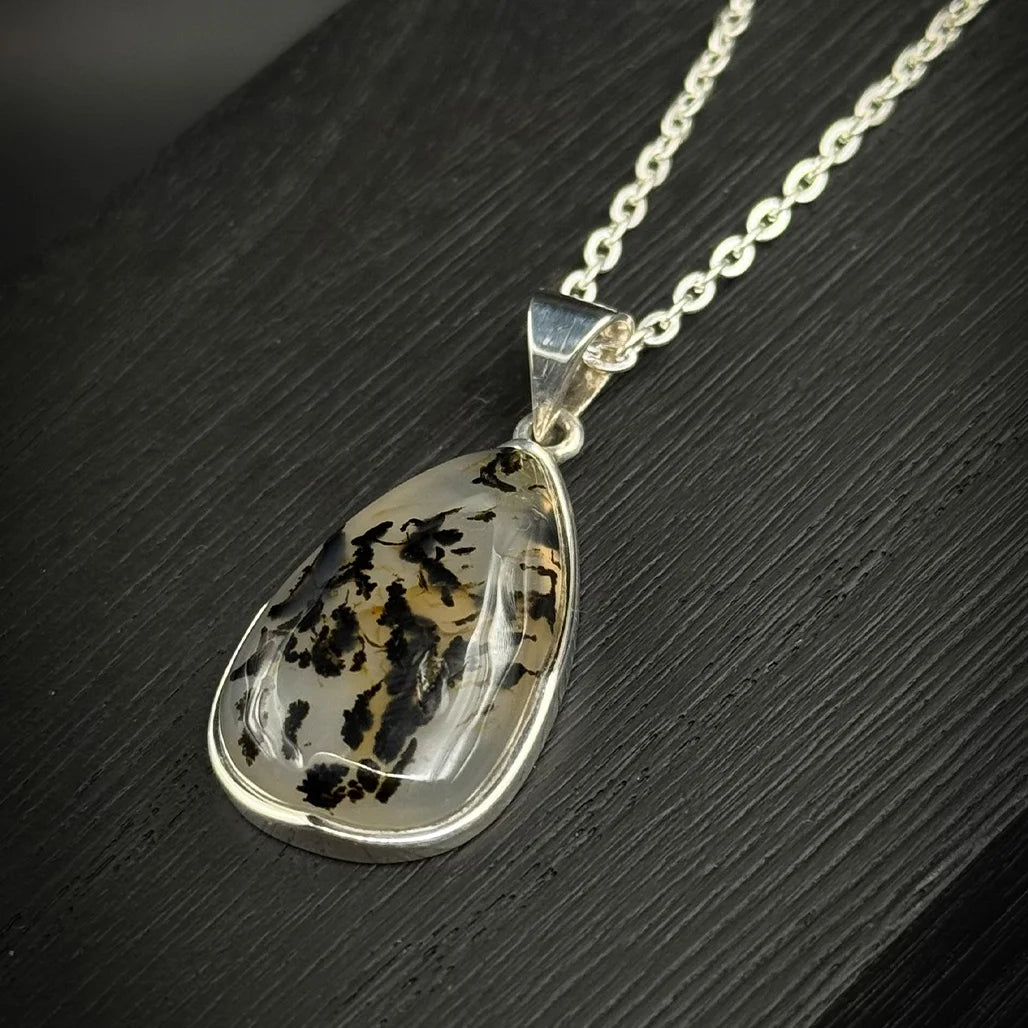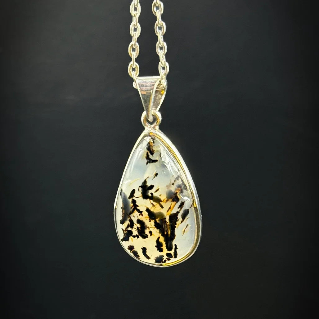 This Montana Agate Pendant, set in sterling silver with delicate scalloped edges, exudes personality and elegance while keeping the spotlight on the natural beauty of the stone. The pendant features an abstract teardrop cut, perfectly balancing and accentuating the intricate dendritic inclusions. These inclusions, rich in deep brown and black tones, stand out beautifully against the translucent background, further enhanced by swirls of the warm caramel hues that Montana Agate is celebrated for.