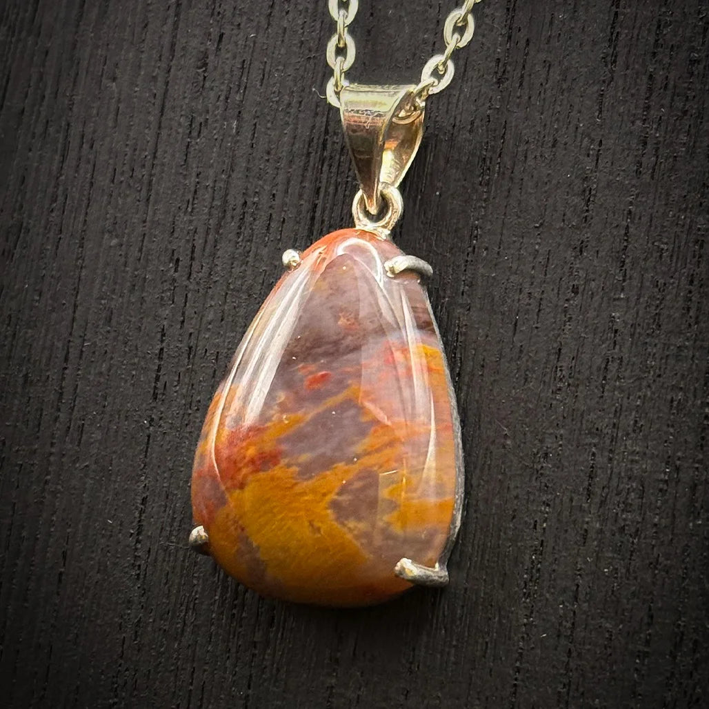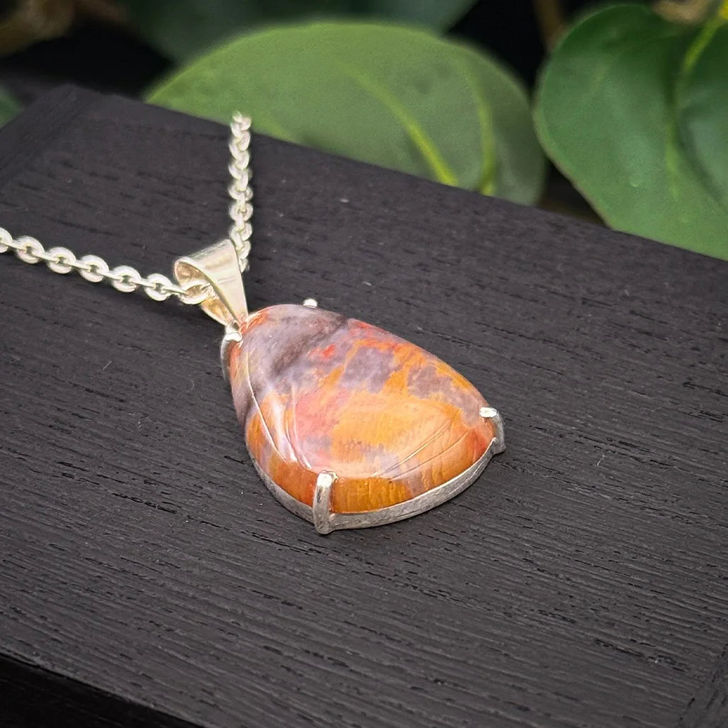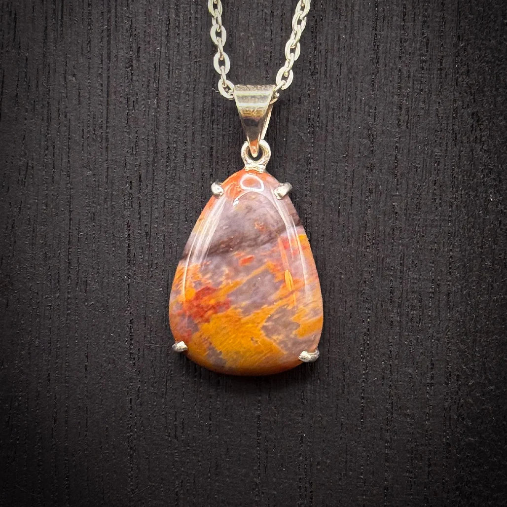 This breathtaking Petrified Wood pendant showcases nature’s artistry in vivid detail. Hand-cut and polished by George, the stone features a striking palette of deep oranges, fiery reds, and warm golden tones that ripple across a cool, slate-gray base. The interplay of colors creates a dramatic, almost three-dimensional appearance, while subtle black striations add depth and intrigue—like brushstrokes on a stone canvas.