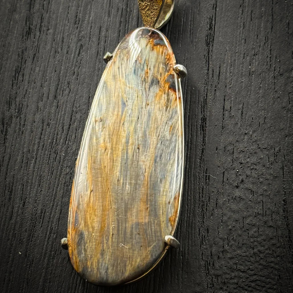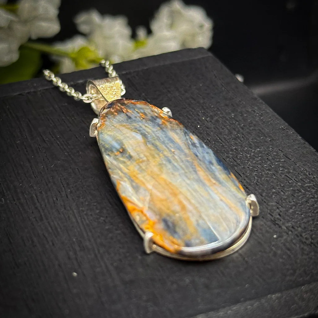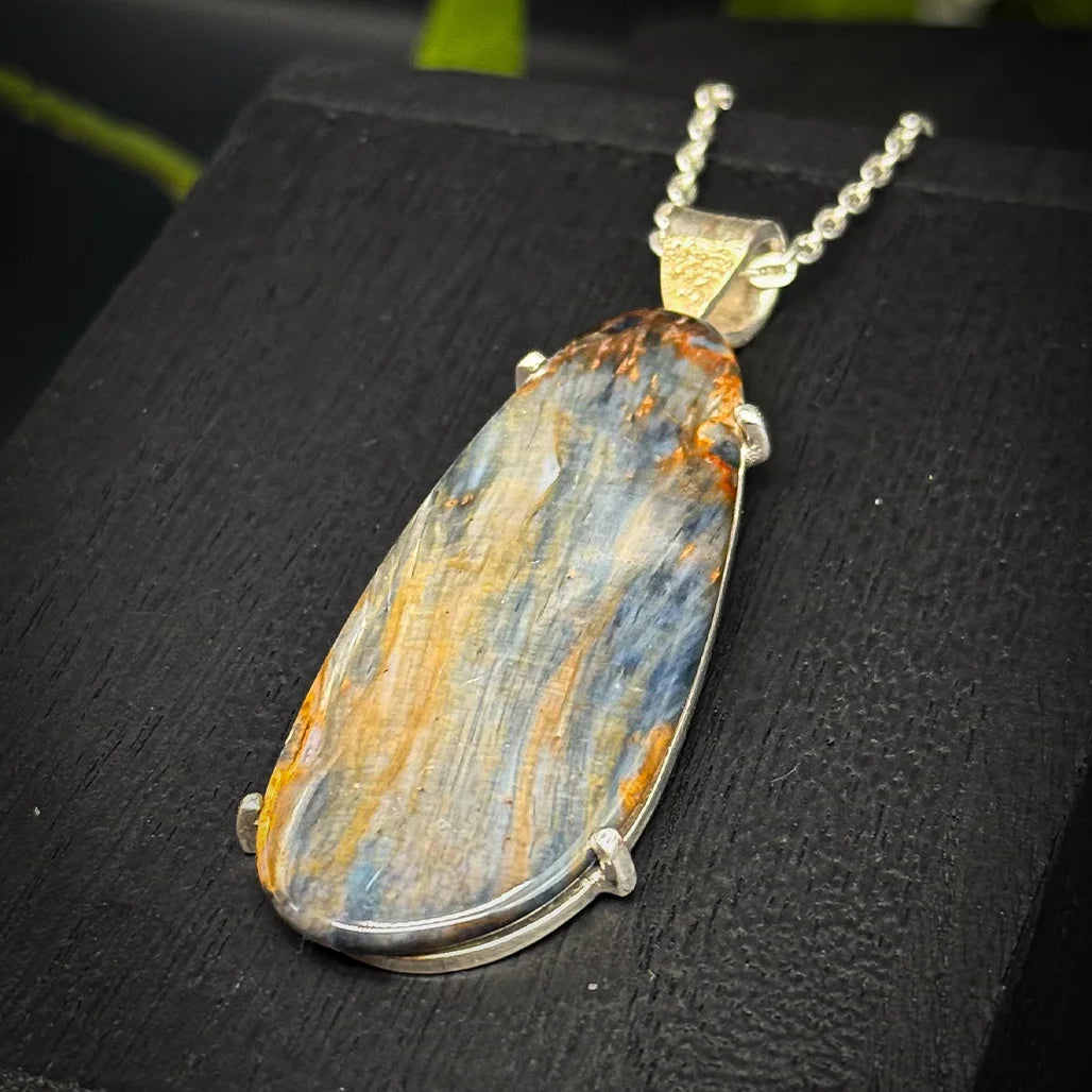 This Pietersite pendant is nothing short of mesmerizing. Cut by George into an elegant, elongated oval, the shape showcases a spectrum of color and movement in the stone. Brilliant flashes of blue, silver, and gold ripple across the surface, creating an effect that looks almost otherworldly—like lightning frozen in stone.