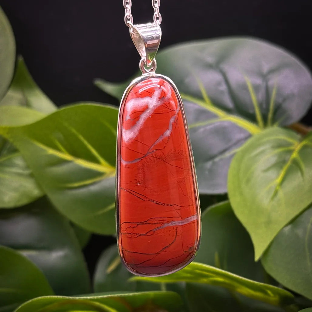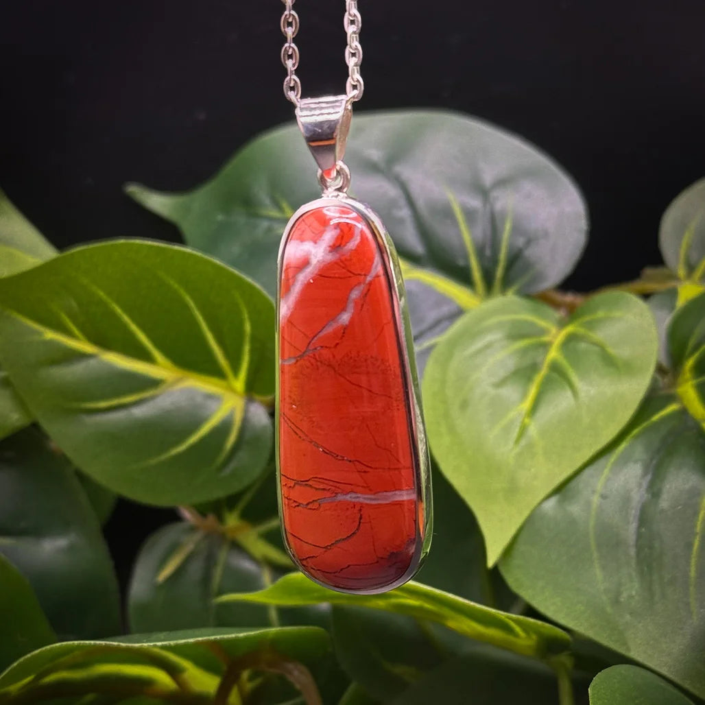 Bold, vibrant, and full of fire—this Red Jasper pendant is a true attention-grabber. George hand-cut this striking stone into a sleek, elongated oval shape that perfectly frames its rich red color and dramatic natural patterns. Delicate white agate inclusions dance across the surface like lightning through a desert sky, adding movement and visual intrigue to the stone’s powerful hue.