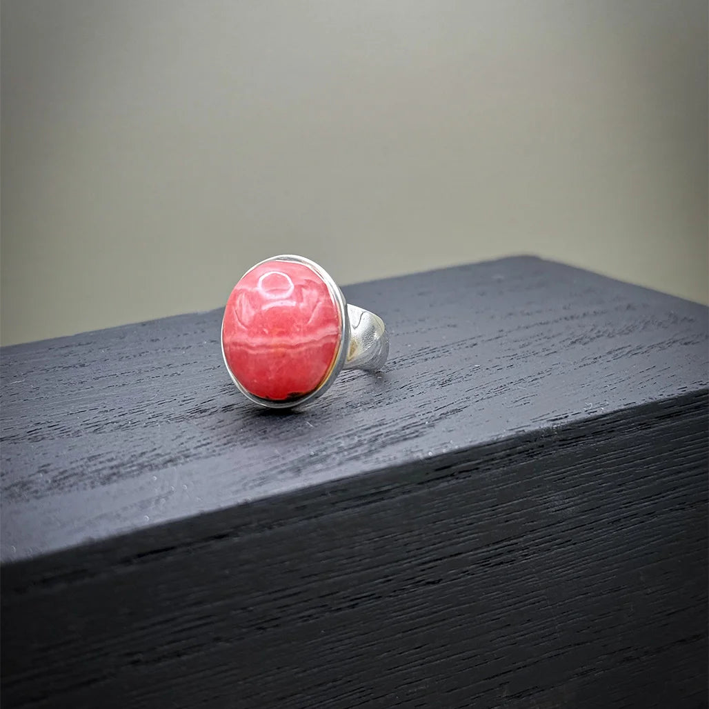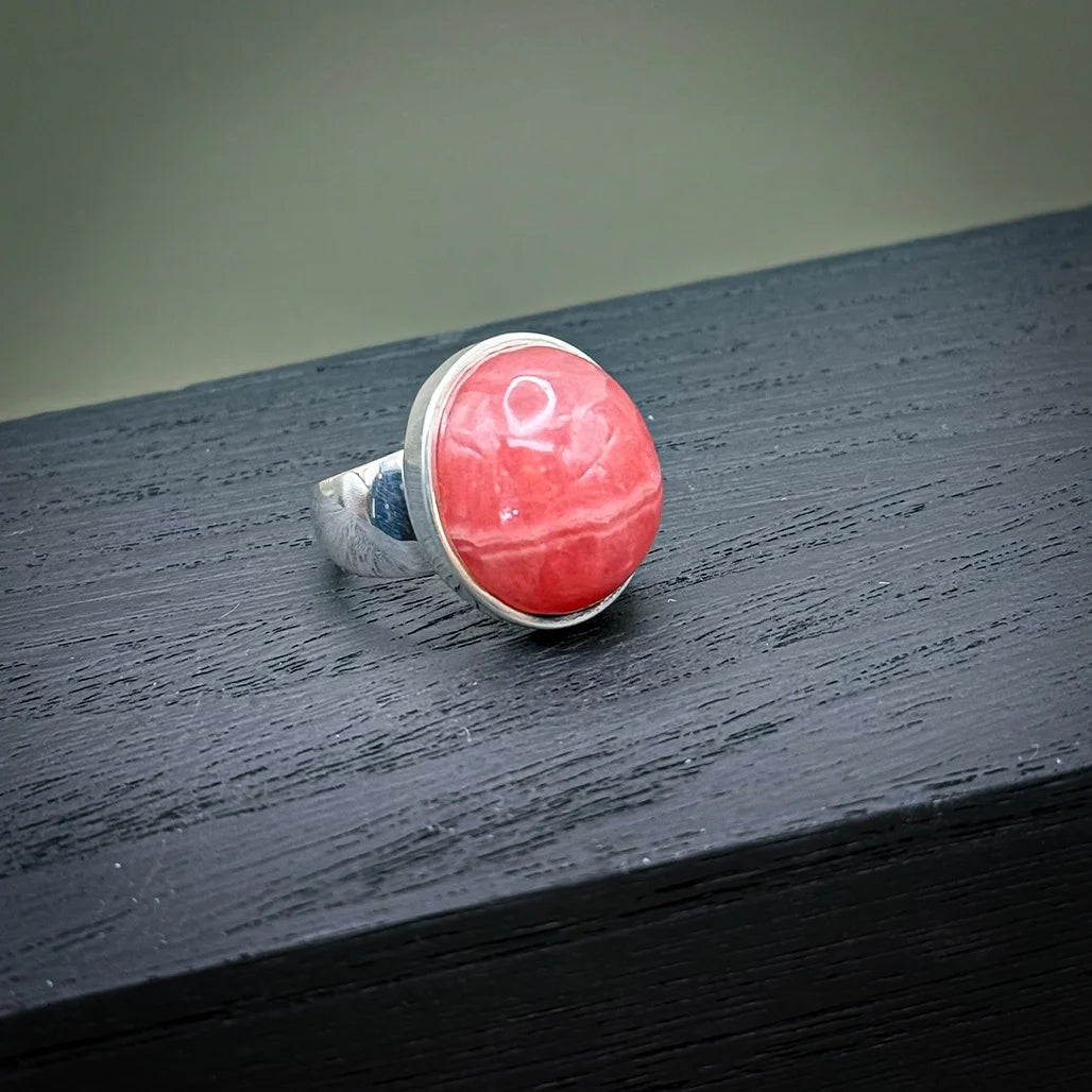 This Rhodochrosite Ring is truly breathtaking and a must-have for anyone who loves bold and unique jewelry! Set in sterling silver and sized at 7, it features a vibrant, high-dome Rhodochrosite stone that immediately commands attention. Its intense, lustrous rose color is beautifully accented by the delicate white banding typical of Rhodochrosite, giving it a natural elegance.