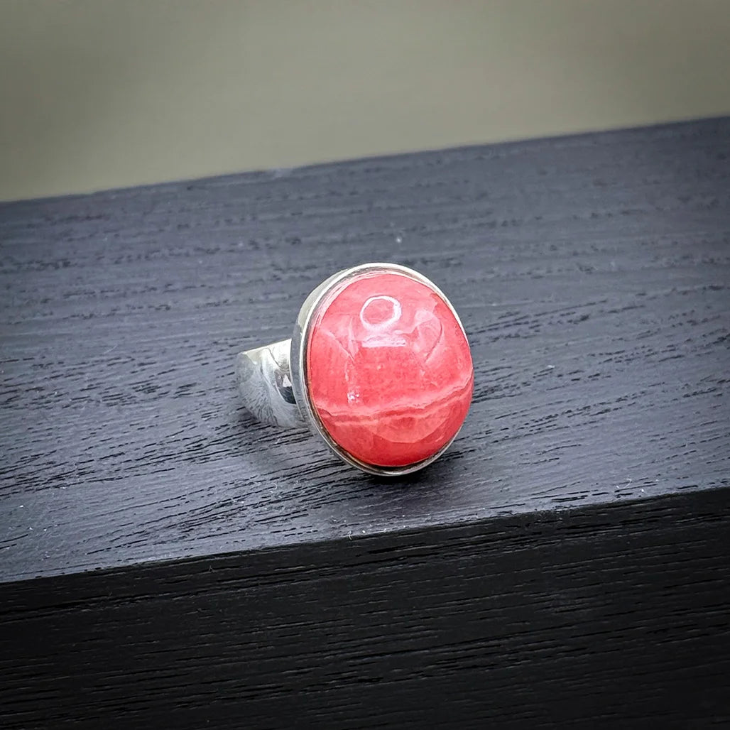 To make it even more special, this piece includes a few dazzling rainbow inclusions, often referred to as an "iris," adding a touch of sparkle and magic. Whether you're a dedicated Rhodochrosite lover or simply someone who appreciates one-of-a-kind fine jewelry, this ring is the perfect statement piece. As always, we offer free sizing on all rings (within reason) to ensure the design remains flawless and the fit perfect. Add this stunning piece to your collection today!