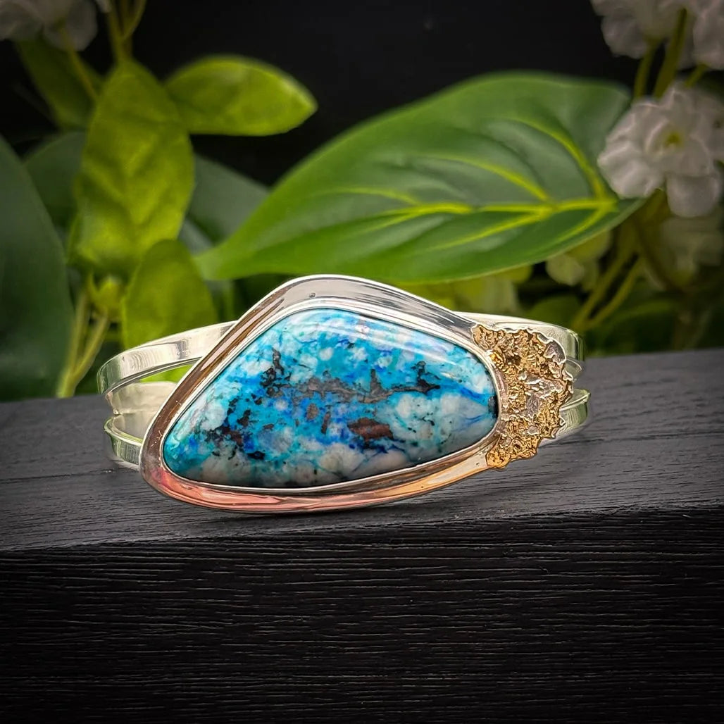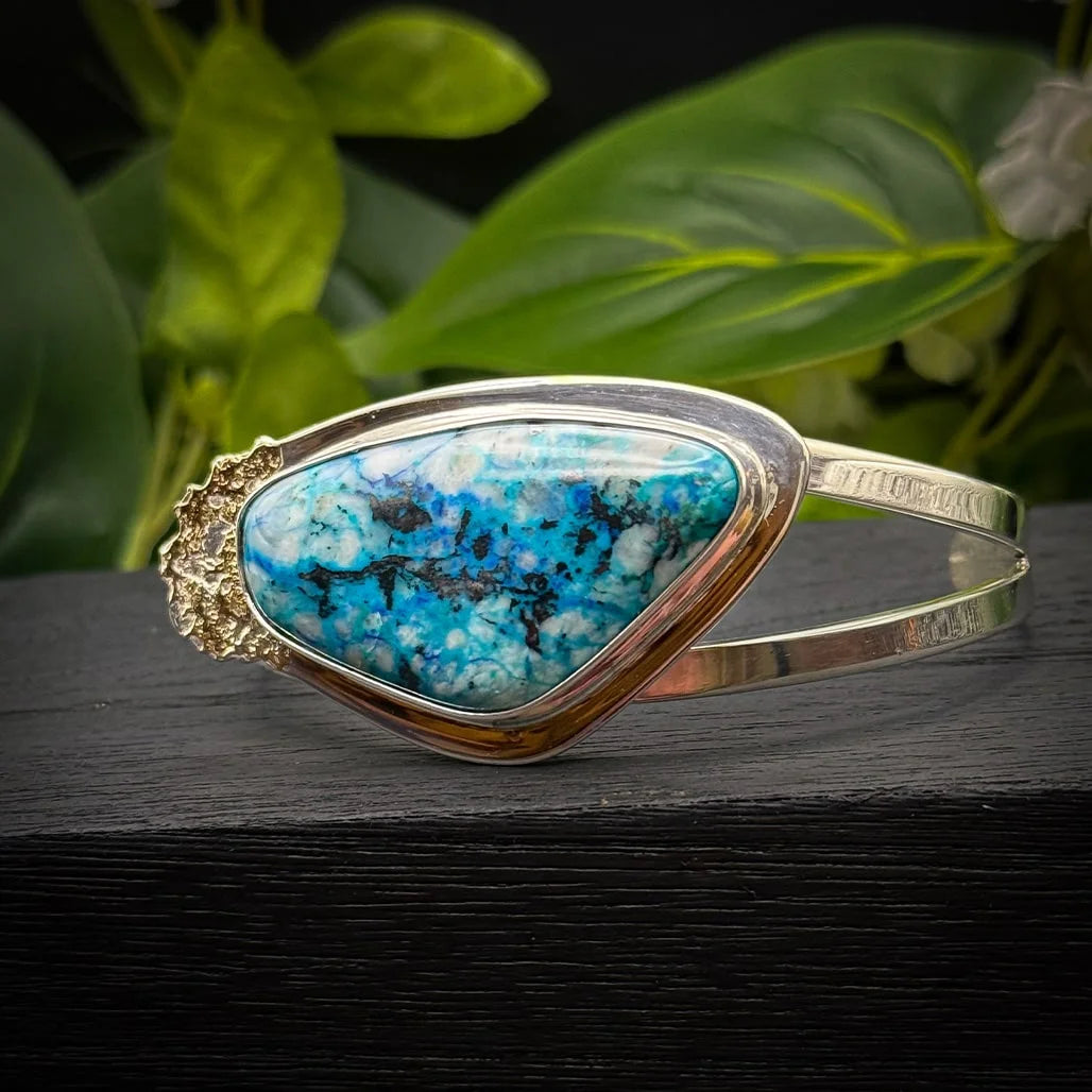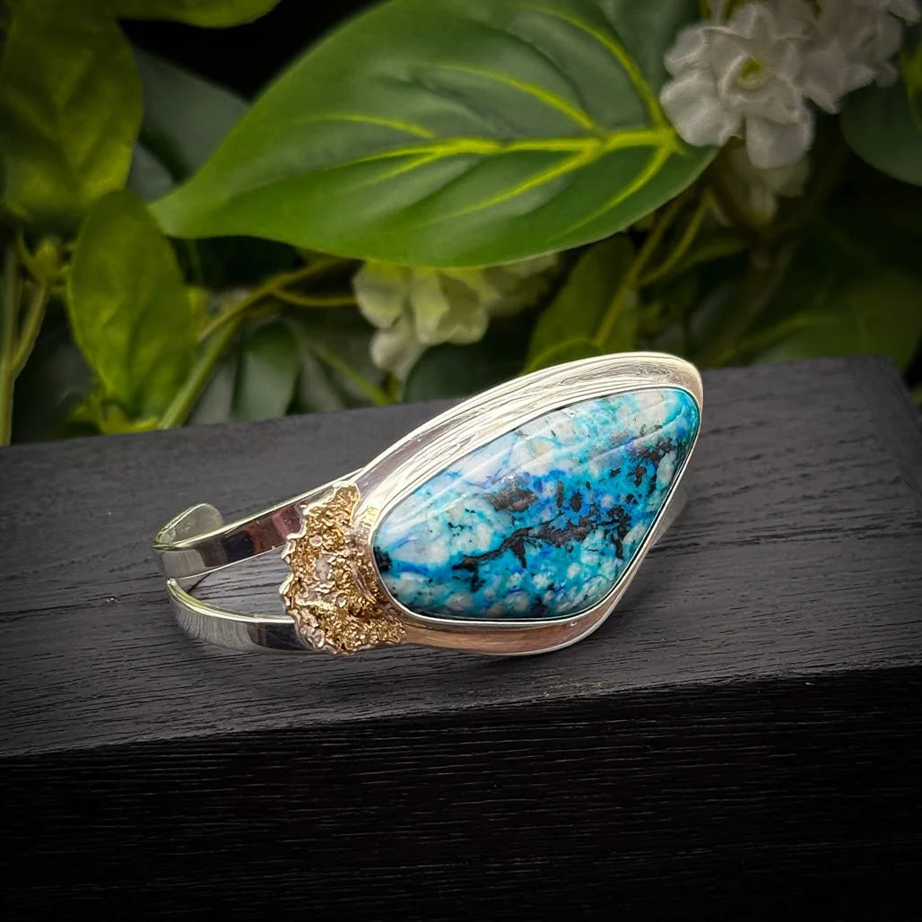 This breathtaking bracelet features a striking Shattuckite stone, hand-cut by George into an abstract shape that highlights its natural beauty. The stone displays incredibly vibrant blue hues with intricate patterns, making it a true statement piece.