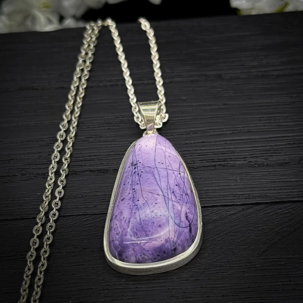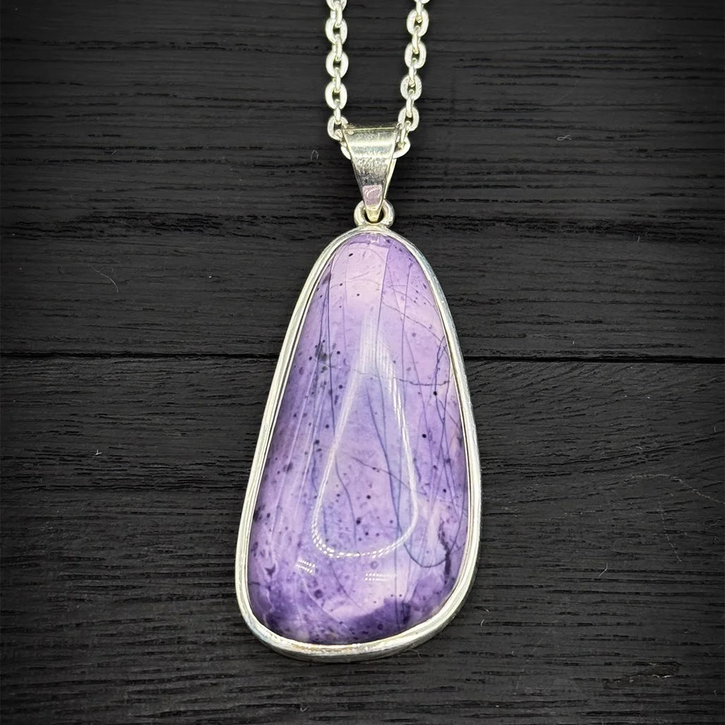 This Tiffany Stone Pendant is a true statement of elegance and individuality. Crafted from a stunning piece of Tiffany Stone, it showcases soft lavender hues seamlessly blended with deep violet-purple inclusions, creating a captivating contrast that exudes personality.